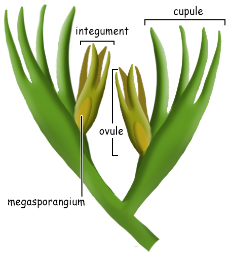 The evolution of the seed is the single most important adaptation of the embryophytes for their transition to a fully terrestrial plant life history. The early steps in this transition that allowed the production of the seed began early in the Devonian with the change from homospory to heterospory. But other adaptations complemented the evolution from homospory to heterospory that allowed not simply the transition to land, but to towering seed plants in vast forests. Homospory to Heterospory The transition from small spores of uniform size to two sizes of spores, large megaspores and small microspores, indicated more than simply differences in spore size. Heterospory indicates a major genetic transformation that changed how sex was determined in plants. The homosporic condition leads to spores that are all the same size, but also the same genetic composition. Spores from homosporous plants germinate to form gametophytes that are potentially bisexual and that can produce both female archegonia and male antheridia. Many homosporous plants have gametophytes that, in fact, are bisexual and do produce both archegonia and antheridia. In others, although the potentual for the bisexual condition exists, the environment influences whether the gametophyte will produce archegonia, antheridia or both. In heterosporous plants, the spores are genetically different, carrying genes for either maleness or femaleness. Megaspores have genes that determine the female mating type and microspores the genes for the male mating type. These spores germinate and form gametophytes that will be either male or female and, since haploid, only the genes for one sex. When haploid eggs are produced by mitosis, they will contain a gene that determines "female"; when haploid sperm are produced by mitosis, they will contain a gene that determines "male". The fusion of a male sperm and a female egg (syngamy) will result in a zygote that contains both male and female genes and will grow to become a diploid sporophyte with both "sex genes". During the formation of spores by meiosis in the sporophyte, these sex genes will again be separated into haploid spores to produce the next generation of male and female gametophytes. If the female gene is represented by "a" and the male gene by "b", the megaspores will be represented by a and the microspores by b. Sperm can fertilize only eggs, so syngamy will always result in a zygote carrying both genes, a/b.