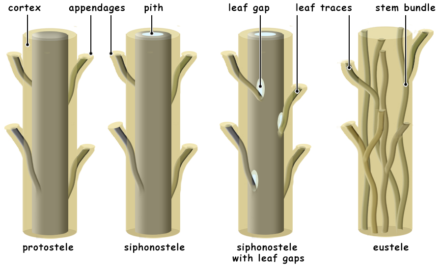 Protostele to Eustele Maybe the easiest to understand from structural considerations, is the advantage of more complex steles over the protostele. (Stele literally translates to upright pillar or column and refers to the vascular column of plants.) The earliest stele, the protostele, comprised only primary vascular tissue in a central core of the plant and could have a diameter no larger than the diameter of the apical meristem. This means that in the earliest land plants, such as Rhynia, the upright stems could be only a few milimeters in diamter. In some plants, like the Psaronius fern, the sporophyte first developed a massive apical meristem that allowed much larger protosteles. Siphonosteles are distinguished from protosteles by having a central pith surrounded by a cylinder of vascular tissue. This cylinder was more substantial and, like a soda straw, is structurally stronger than a simple stele. In addition, in many plants with siphonosteles, the vascular tissue of the cylinder retained the ability to divide, this becoming a vascular cambium, and the girth of the stem could enlarge. ![]() The most advanced eustele condition resulted in a stele that formed an anastomosing system of vascular bundles, each of which consisted of a bifacial vascular cambium. A bifacial vascular bundle produces new xylem (meta xylem) to the inside and new phloem (metaphloem) to the outside. This condition allows the trunk and stems to grow in girth and causes the older, outer tissues to crack as the interior enlarges. Along with this condition, parenchyma of the cortex gained the ability to divide and formed a layer of meristematic tissue outside the vascular bundles and and inside the outermost, dead layers of the bark. The vascular cambium and this cork cambium are the only tissues of the trunk and stem that can divide. Because the vascular cambium produces the newest cells to the exterior of the xylem and the interior of the phloem, the xylem continuously grows, layer upon layer, like dipping a candle. On the other hand, the newest phloem pushes the outer, older phloem outward, it cracks and the cork cambium "heals" the wounds created and forms the bark of these trees. There is no simple evolutionary line leading from plants with protosteles to plants with eusteles. Different evolutionary lineages adapted in many different ways to produce steles of various kinds. Enations to Leaves Like the steles of vascular plants, there is no singular evolutionary line leading from naked stems to megaphyllous leaves. Independent evolutionary steps occurred in the diverging plant phyla resulting in a diversity of leaf types. Also, like stelar evolution, this has resulted in great difficulties in developing a theory of how leaves and stems evolved . . . because they did so at different times and in different ways. It is best to consider the advantages conferred for each type of photosynthetic tissue type from a smooth photosynthetic epidermis, to small non-vascularized, spine-like enations, to the luxurient leaves of tropical plants. The first plants on land, the bryophytes, had phyllids that increased photosynthetic surfaces but that restricted them to aquatic habitats or wet habitats on land. Several adaptations of mosses allowed them to survive dessication, but never were able to achieve great heights. The problem is that large surface-to-volume (S/V) ratios favor evaporation and drying. To succeed on land, evaporation must be conquered. The earliest vascular land plants had simple, smooth stems which provided a favorable S/V ratio. Like the barrel cacti of deserts, a large volume and a small surface area allow them to "protect" an inner reservoir of water; any extended flat surface would lead to dehydration. Enations are small, non-vascularized scale-like outgrowths from the stems. Some hypothesize that their advantage was that it increased photosyhtetic surface are, while others propose that, like spines, they helped to protect the plant from insects which had invaded land long before plants. Both are probably true. ![]() Once vascular tissue had evolved to better draw and distribute water from the soil, the luxury of having expanded photosynthetic surfaces was allowed and, in fact, leaves through evapotranspiration help to draw water from the soil. Leaves are defined as flatttened, photosynthetic structures attached to a stem and which contains an extension of vascular tissue from the stem. The simplest leaves have a single, unbranched vascular strand and are referred to as microphylls. And, although evolutionarily microphylls were indeed small, many plants developed enormous microphylls, some of which were more than three feet long, such as those of the lycophyte, Sigillaria. Megaphyll leaves are defined by leaves that have branching vascular bundles. Different theories exist for the transition from a leaf with a single vascular strand to one of many, anastomosing "veins" of vasular bundles. One such theory is the "telome theory" which states that leaves originated by the reduction in size of branches, the flattening of the plane of those branches, and the development of webbing between the reduced, flattened, branching system. This appears to be an untenable theory because it is far too complex when compared to the simple theory that enations became vascularized, expanded and the leaf vascular bundles branched . . . how simple is that? Vascular bundles branched from the stele to enter the leaf, why could they simply not continue to branch? Occam's Razor: of two theories that explain the same phenomenon, the simpler is more likely correct. |